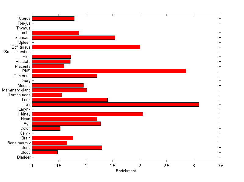 The expression level is normalized with tissue-library size. Each value for a gene in a tissue is a ratio of observed ESTs to the expected one in this tissue. The expected number of ESTs is the product of total ESTs of the gene and the fraction of total ESTs in the tissue among all ESTs in 30 tissues.