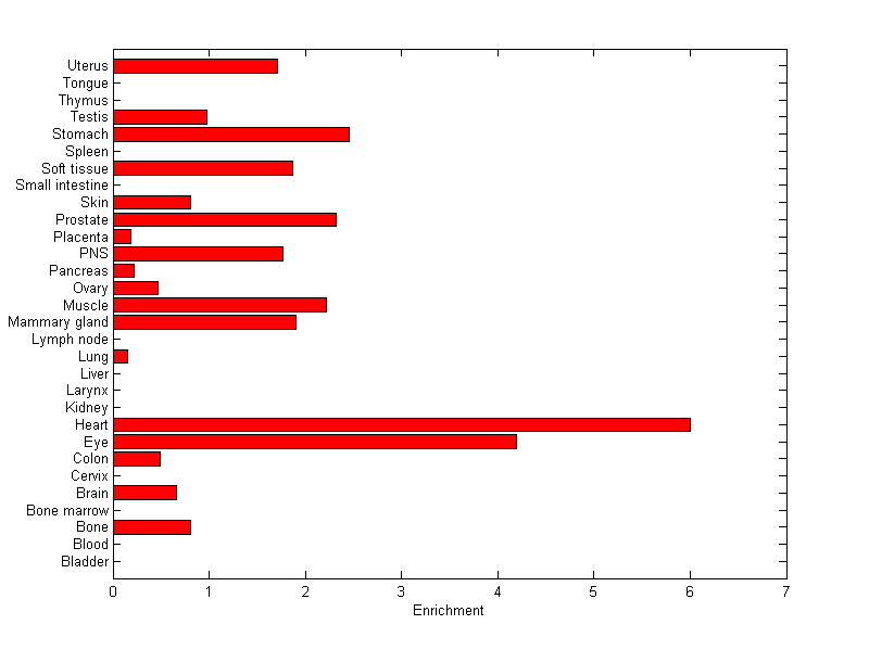 The expression level is normalized with tissue-library size. Each value for a gene in a tissue is a ratio of observed ESTs to the expected one in this tissue. The expected number of ESTs is the product of total ESTs of the gene and the fraction of total ESTs in the tissue among all ESTs in 30 tissues.