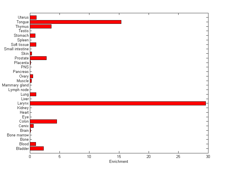 The expression level is normalized with tissue-library size. Each value for a gene in a tissue is a ratio of observed ESTs to the expected one in this tissue. The expected number of ESTs is the product of total ESTs of the gene and the fraction of total ESTs in the tissue among all ESTs in 30 tissues.