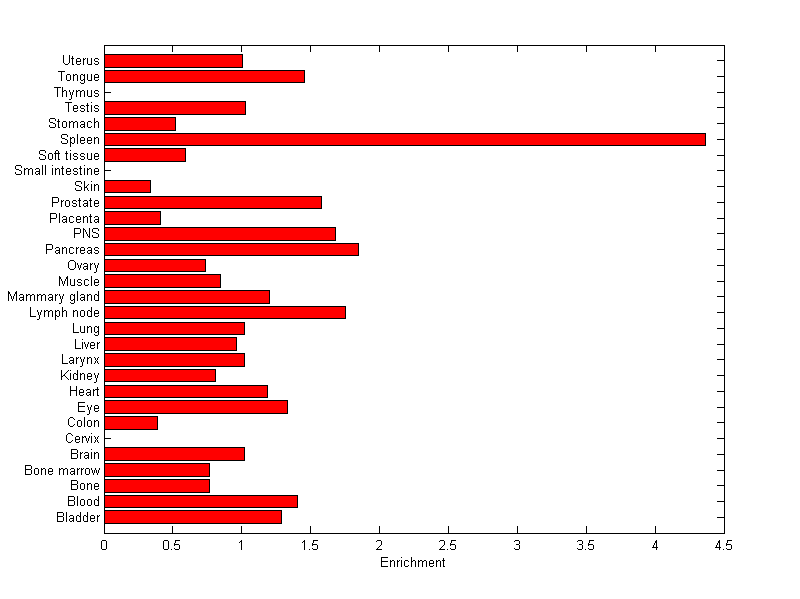 The expression level is normalized with tissue-library size. Each value for a gene in a tissue is a ratio of observed ESTs to the expected one in this tissue. The expected number of ESTs is the product of total ESTs of the gene and the fraction of total ESTs in the tissue among all ESTs in 30 tissues.