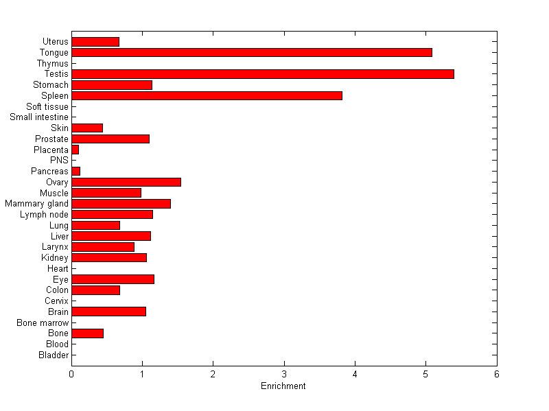 The expression level is normalized with tissue-library size. Each value for a gene in a tissue is a ratio of observed ESTs to the expected one in this tissue. The expected number of ESTs is the product of total ESTs of the gene and the fraction of total ESTs in the tissue among all ESTs in 30 tissues.