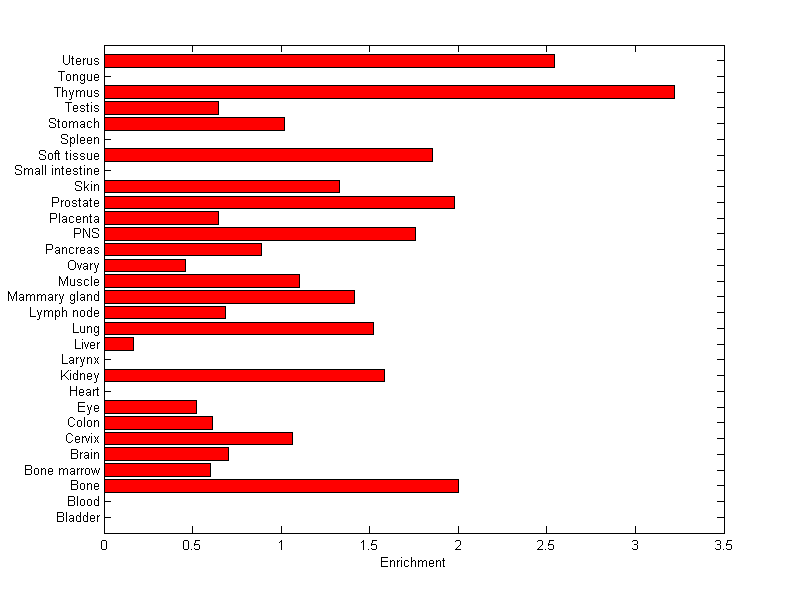 The expression level is normalized with tissue-library size. Each value for a gene in a tissue is a ratio of observed ESTs to the expected one in this tissue. The expected number of ESTs is the product of total ESTs of the gene and the fraction of total ESTs in the tissue among all ESTs in 30 tissues.