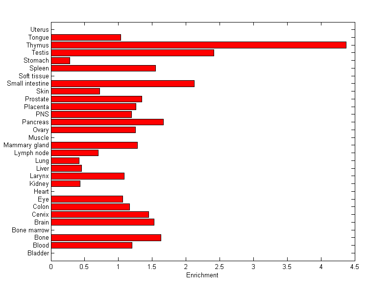 The expression level is normalized with tissue-library size. Each value for a gene in a tissue is a ratio of observed ESTs to the expected one in this tissue. The expected number of ESTs is the product of total ESTs of the gene and the fraction of total ESTs in the tissue among all ESTs in 30 tissues.