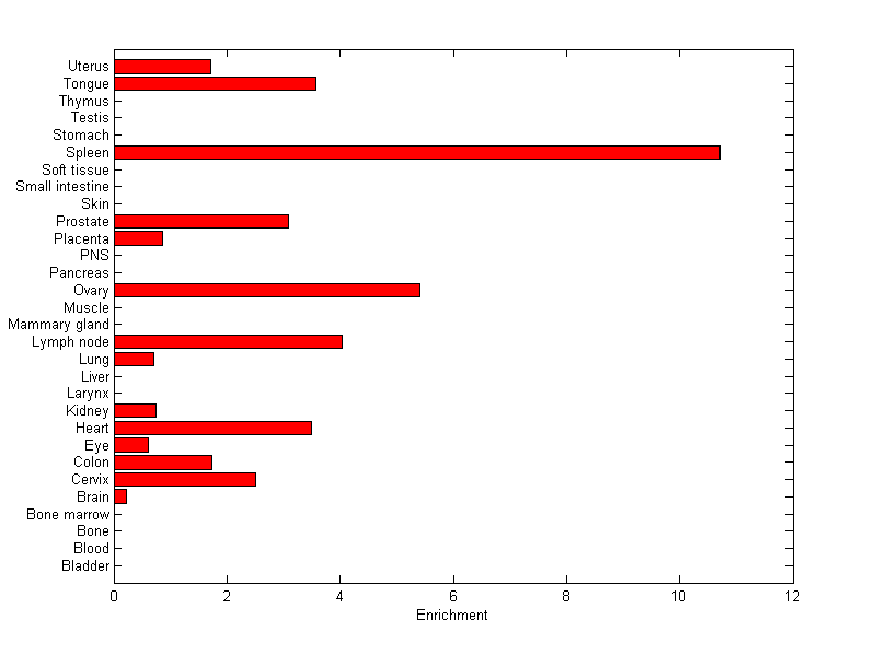 The expression level is normalized with tissue-library size. Each value for a gene in a tissue is a ratio of observed ESTs to the expected one in this tissue. The expected number of ESTs is the product of total ESTs of the gene and the fraction of total ESTs in the tissue among all ESTs in 30 tissues.