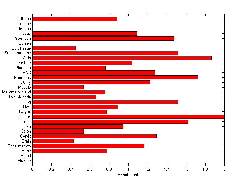 The expression level is normalized with tissue-library size. Each value for a gene in a tissue is a ratio of observed ESTs to the expected one in this tissue. The expected number of ESTs is the product of total ESTs of the gene and the fraction of total ESTs in the tissue among all ESTs in 30 tissues.