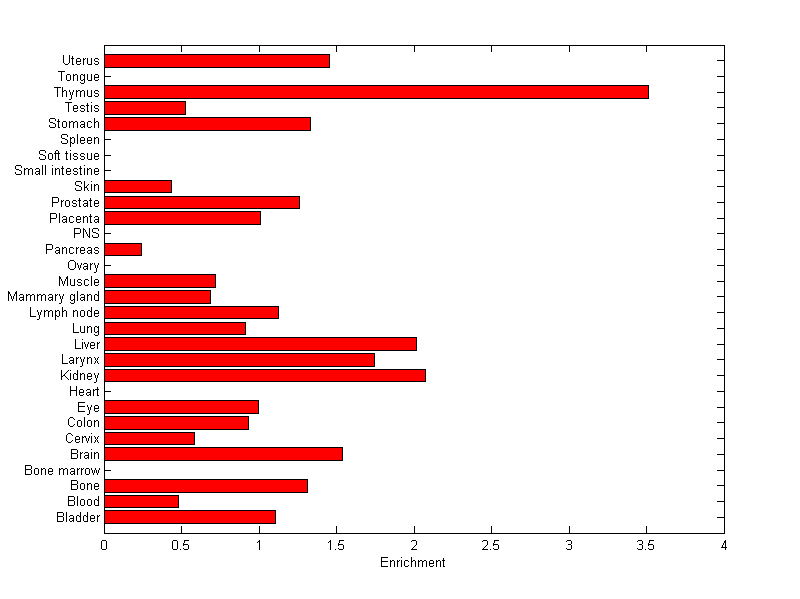 The expression level is normalized with tissue-library size. Each value for a gene in a tissue is a ratio of observed ESTs to the expected one in this tissue. The expected number of ESTs is the product of total ESTs of the gene and the fraction of total ESTs in the tissue among all ESTs in 30 tissues.