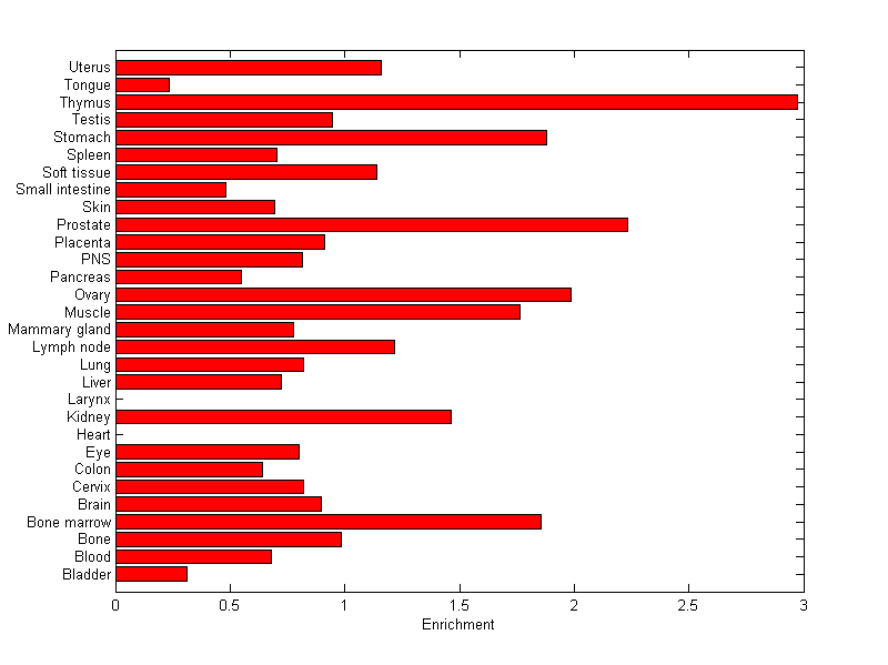 The expression level is normalized with tissue-library size. Each value for a gene in a tissue is a ratio of observed ESTs to the expected one in this tissue. The expected number of ESTs is the product of total ESTs of the gene and the fraction of total ESTs in the tissue among all ESTs in 30 tissues.