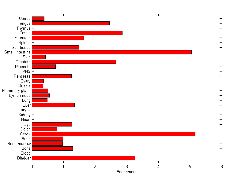 The expression level is normalized with tissue-library size. Each value for a gene in a tissue is a ratio of observed ESTs to the expected one in this tissue. The expected number of ESTs is the product of total ESTs of the gene and the fraction of total ESTs in the tissue among all ESTs in 30 tissues.