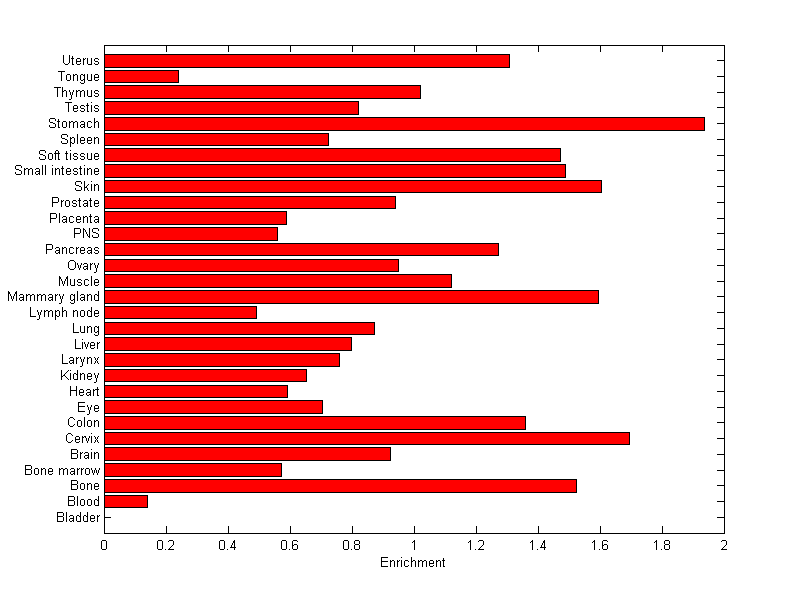 The expression level is normalized with tissue-library size. Each value for a gene in a tissue is a ratio of observed ESTs to the expected one in this tissue. The expected number of ESTs is the product of total ESTs of the gene and the fraction of total ESTs in the tissue among all ESTs in 30 tissues.