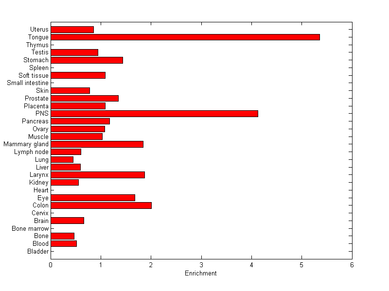The expression level is normalized with tissue-library size. Each value for a gene in a tissue is a ratio of observed ESTs to the expected one in this tissue. The expected number of ESTs is the product of total ESTs of the gene and the fraction of total ESTs in the tissue among all ESTs in 30 tissues.
