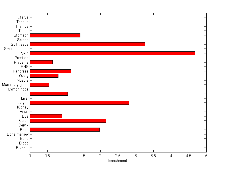The expression level is normalized with tissue-library size. Each value for a gene in a tissue is a ratio of observed ESTs to the expected one in this tissue. The expected number of ESTs is the product of total ESTs of the gene and the fraction of total ESTs in the tissue among all ESTs in 30 tissues.