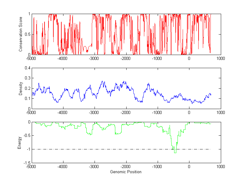 About the profiles: The conservation profile (red curve) is about conservation scores of the promoter sequences. Conservation was determined from an eight-way alignment of human, chimpanzee, dog, mouse, rat, chicken, zebrafish and fugu sequences. The conservation was quantified by a conservation score between 0 and 1, with 1 as highest conservation. The conservation score was obtained from UCSC genome databases. The density profile (blue curve) is about density of all TF binding sites. The energy profile (green curve) is about energy for module detection based on TF interaction. The positions with energy less than -1 indicate the existence of CRMs. Download: Conservation profileDensity profile Energy profile CRM summary |