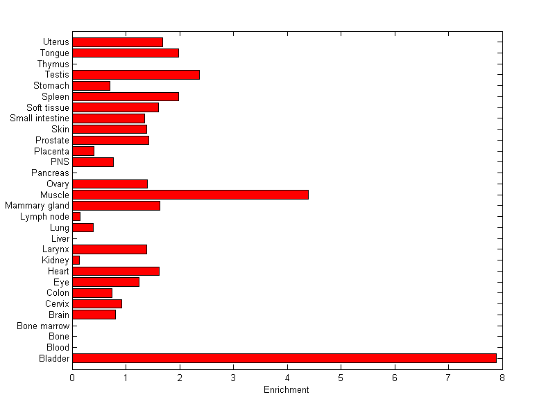 About the profile: The expression level is normalized with tissue-library size. Each value for a gene in a tissue is a ratio of observed ESTs to the expected one in this tissue. The expected number of ESTs is the product of total ESTs of the gene and the fraction of total ESTs in the tissue among all ESTs in 30 tissues. Summary: This gene is preferentially expressed in [bladder] Download: |