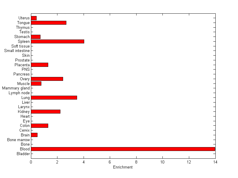 The expression level is normalized with tissue-library size. Each value for a gene in a tissue is a ratio of observed ESTs to the expected one in this tissue. The expected number of ESTs is the product of total ESTs of the gene and the fraction of total ESTs in the tissue among all ESTs in 30 tissues.