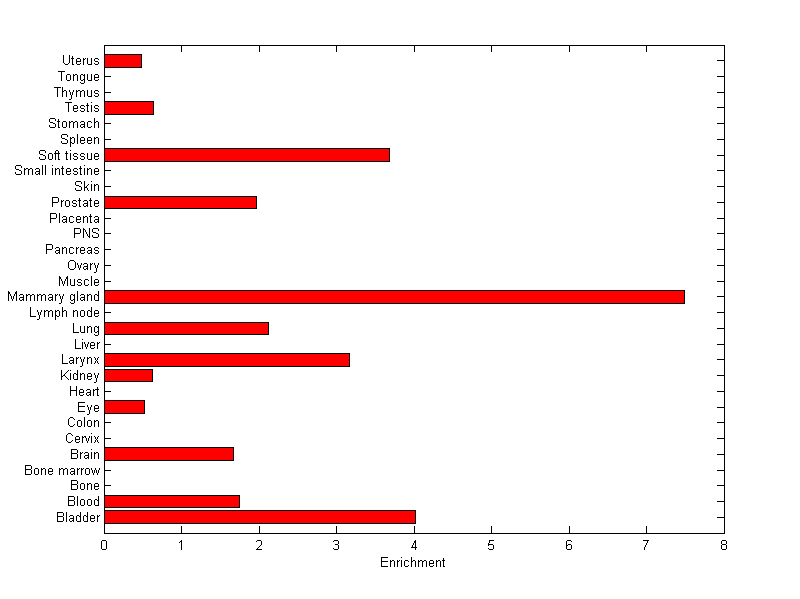 The expression level is normalized with tissue-library size. Each value for a gene in a tissue is a ratio of observed ESTs to the expected one in this tissue. The expected number of ESTs is the product of total ESTs of the gene and the fraction of total ESTs in the tissue among all ESTs in 30 tissues.