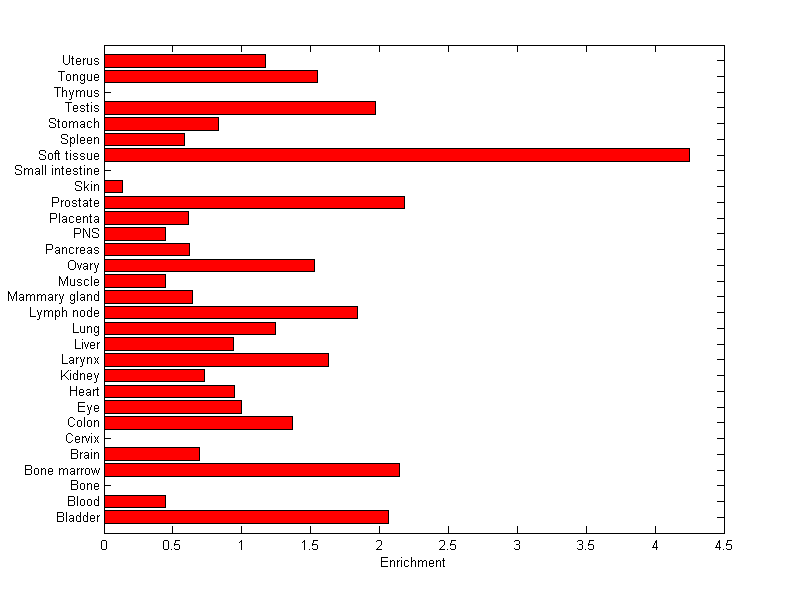 The expression level is normalized with tissue-library size. Each value for a gene in a tissue is a ratio of observed ESTs to the expected one in this tissue. The expected number of ESTs is the product of total ESTs of the gene and the fraction of total ESTs in the tissue among all ESTs in 30 tissues.