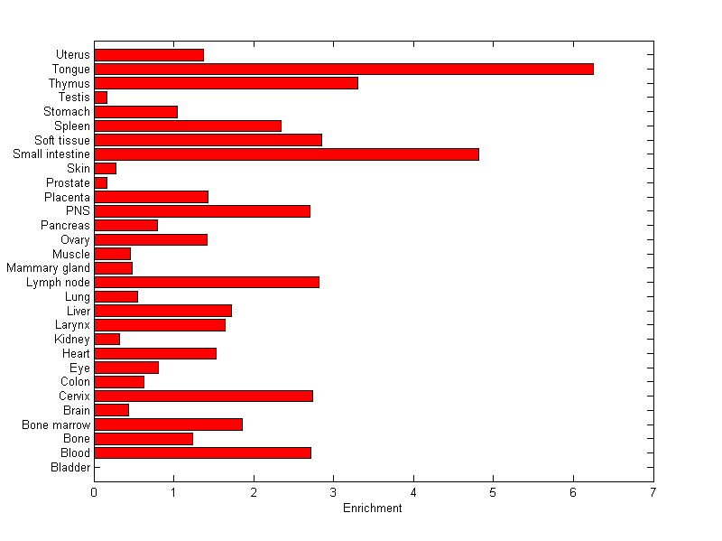 The expression level is normalized with tissue-library size. Each value for a gene in a tissue is a ratio of observed ESTs to the expected one in this tissue. The expected number of ESTs is the product of total ESTs of the gene and the fraction of total ESTs in the tissue among all ESTs in 30 tissues.