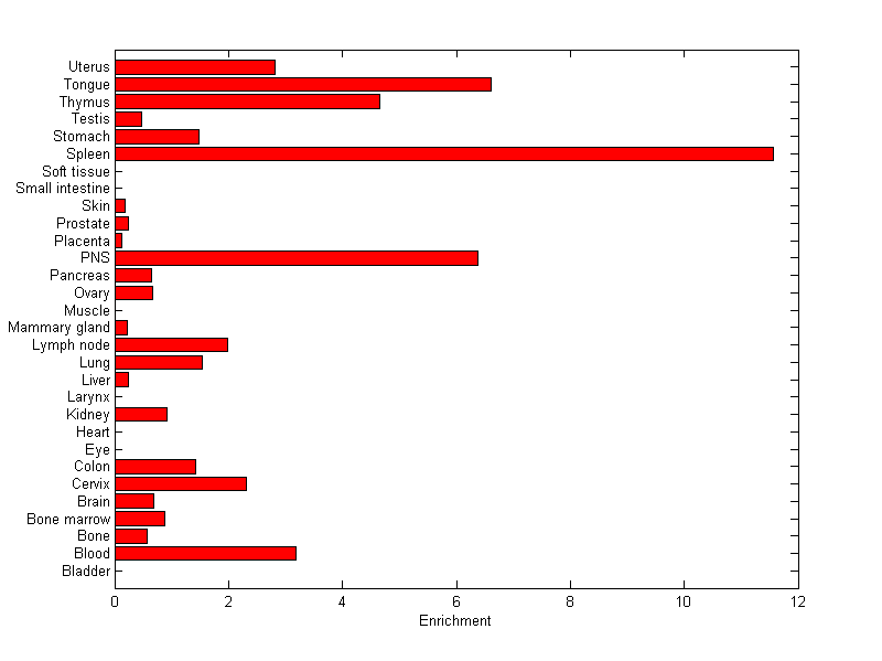 The expression level is normalized with tissue-library size. Each value for a gene in a tissue is a ratio of observed ESTs to the expected one in this tissue. The expected number of ESTs is the product of total ESTs of the gene and the fraction of total ESTs in the tissue among all ESTs in 30 tissues.