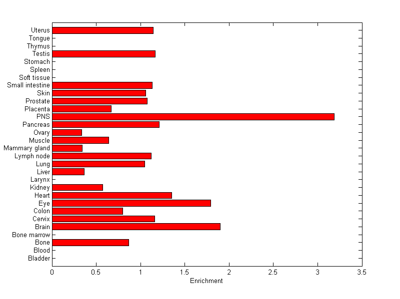 The expression level is normalized with tissue-library size. Each value for a gene in a tissue is a ratio of observed ESTs to the expected one in this tissue. The expected number of ESTs is the product of total ESTs of the gene and the fraction of total ESTs in the tissue among all ESTs in 30 tissues.