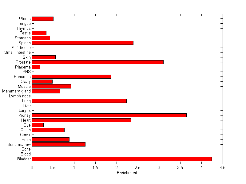 The expression level is normalized with tissue-library size. Each value for a gene in a tissue is a ratio of observed ESTs to the expected one in this tissue. The expected number of ESTs is the product of total ESTs of the gene and the fraction of total ESTs in the tissue among all ESTs in 30 tissues.