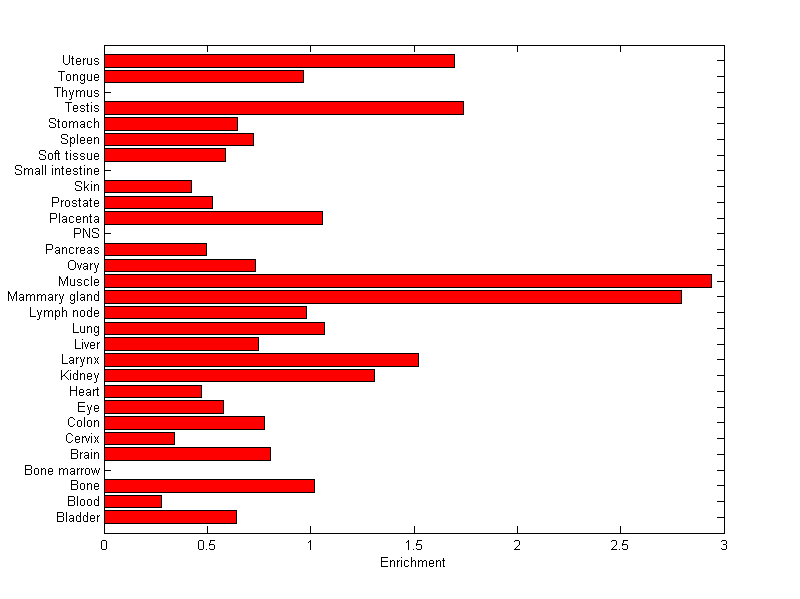 The expression level is normalized with tissue-library size. Each value for a gene in a tissue is a ratio of observed ESTs to the expected one in this tissue. The expected number of ESTs is the product of total ESTs of the gene and the fraction of total ESTs in the tissue among all ESTs in 30 tissues.