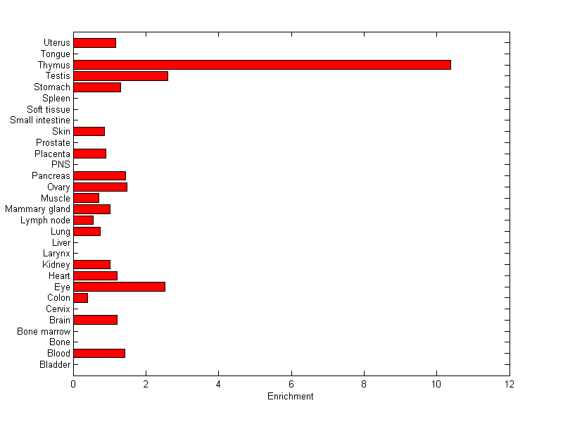 The expression level is normalized with tissue-library size. Each value for a gene in a tissue is a ratio of observed ESTs to the expected one in this tissue. The expected number of ESTs is the product of total ESTs of the gene and the fraction of total ESTs in the tissue among all ESTs in 30 tissues.