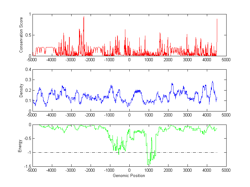 The energy profile (green curve) is about energy for module detection based on TF interaction. The positions with energy less than -1 indicate the existence of CRMs.