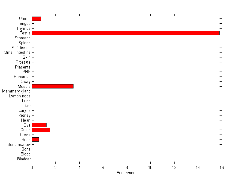 The expression level is normalized with tissue-library size. Each value for a gene in a tissue is a ratio of observed ESTs to the expected one in this tissue. The expected number of ESTs is the product of total ESTs of the gene and the fraction of total ESTs in the tissue among all ESTs in 30 tissues.
