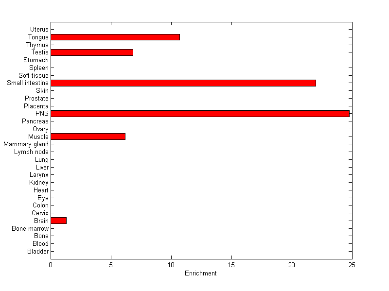 The expression level is normalized with tissue-library size. Each value for a gene in a tissue is a ratio of observed ESTs to the expected one in this tissue. The expected number of ESTs is the product of total ESTs of the gene and the fraction of total ESTs in the tissue among all ESTs in 30 tissues.