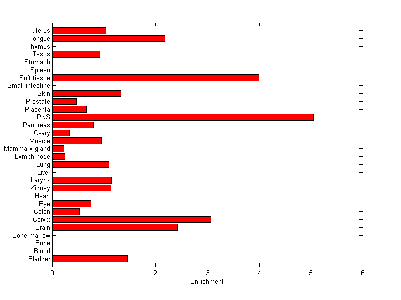 The expression level is normalized with tissue-library size. Each value for a gene in a tissue is a ratio of observed ESTs to the expected one in this tissue. The expected number of ESTs is the product of total ESTs of the gene and the fraction of total ESTs in the tissue among all ESTs in 30 tissues.
