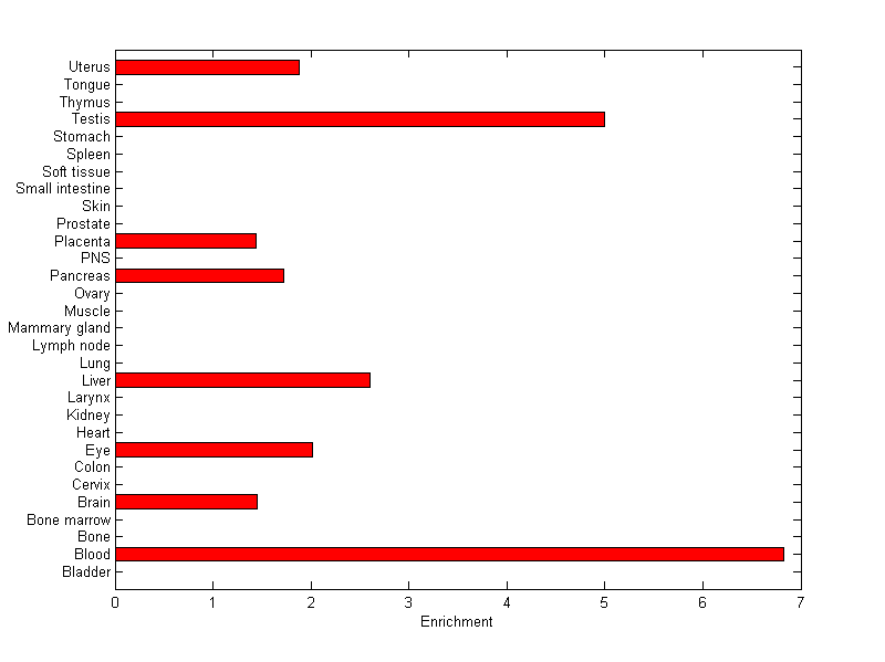The expression level is normalized with tissue-library size. Each value for a gene in a tissue is a ratio of observed ESTs to the expected one in this tissue. The expected number of ESTs is the product of total ESTs of the gene and the fraction of total ESTs in the tissue among all ESTs in 30 tissues.