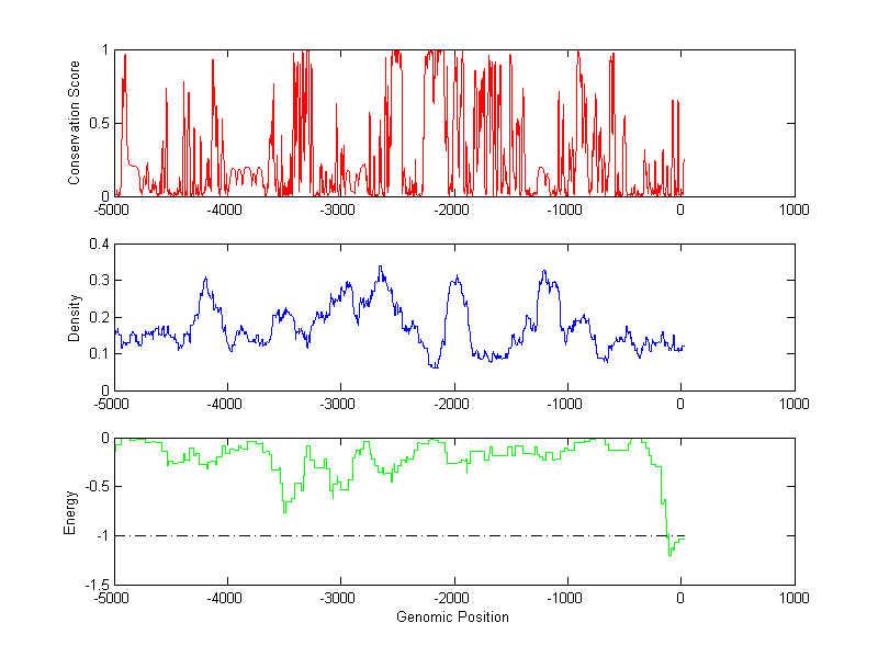 The energy profile (green curve) is about energy for module detection based on TF interaction. The positions with energy less than -1 indicate the existence of CRMs.