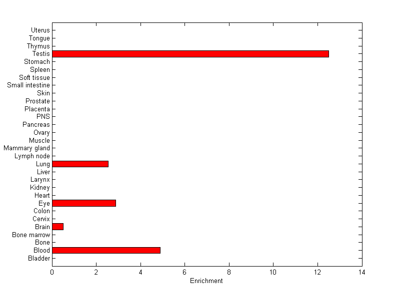 The expression level is normalized with tissue-library size. Each value for a gene in a tissue is a ratio of observed ESTs to the expected one in this tissue. The expected number of ESTs is the product of total ESTs of the gene and the fraction of total ESTs in the tissue among all ESTs in 30 tissues.