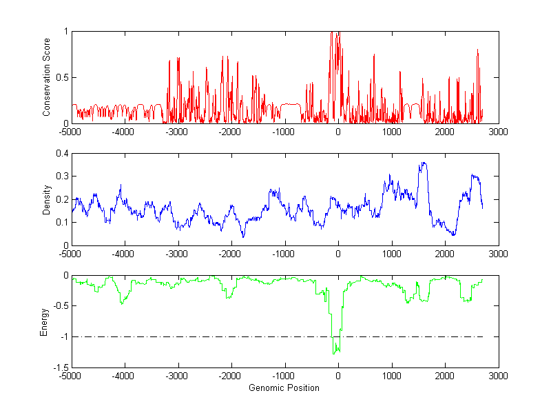 The energy profile (green curve) is about energy for module detection based on TF interaction. The positions with energy less than -1 indicate the existence of CRMs.