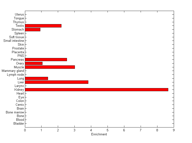 The expression level is normalized with tissue-library size. Each value for a gene in a tissue is a ratio of observed ESTs to the expected one in this tissue. The expected number of ESTs is the product of total ESTs of the gene and the fraction of total ESTs in the tissue among all ESTs in 30 tissues.