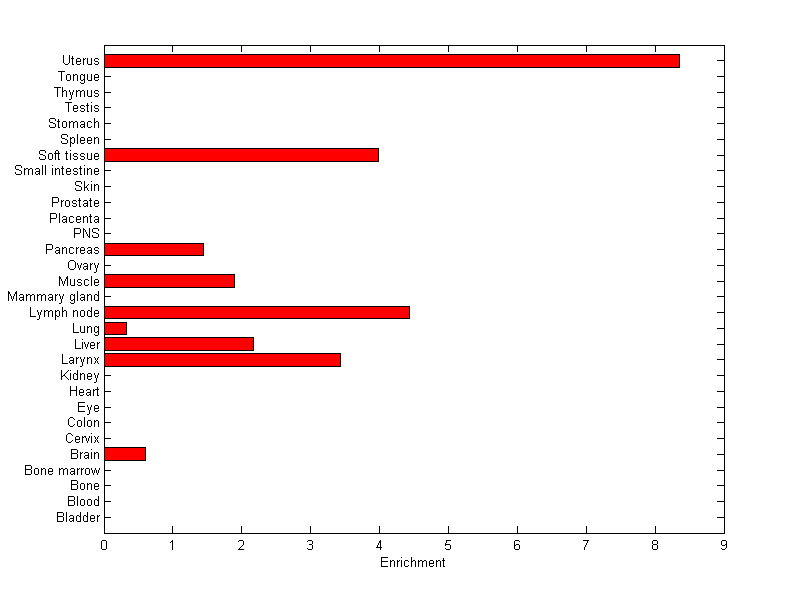 The expression level is normalized with tissue-library size. Each value for a gene in a tissue is a ratio of observed ESTs to the expected one in this tissue. The expected number of ESTs is the product of total ESTs of the gene and the fraction of total ESTs in the tissue among all ESTs in 30 tissues.