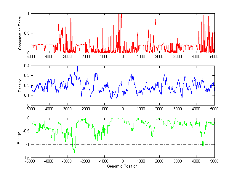 The energy profile (green curve) is about energy for module detection based on TF interaction. The positions with energy less than -1 indicate the existence of CRMs.