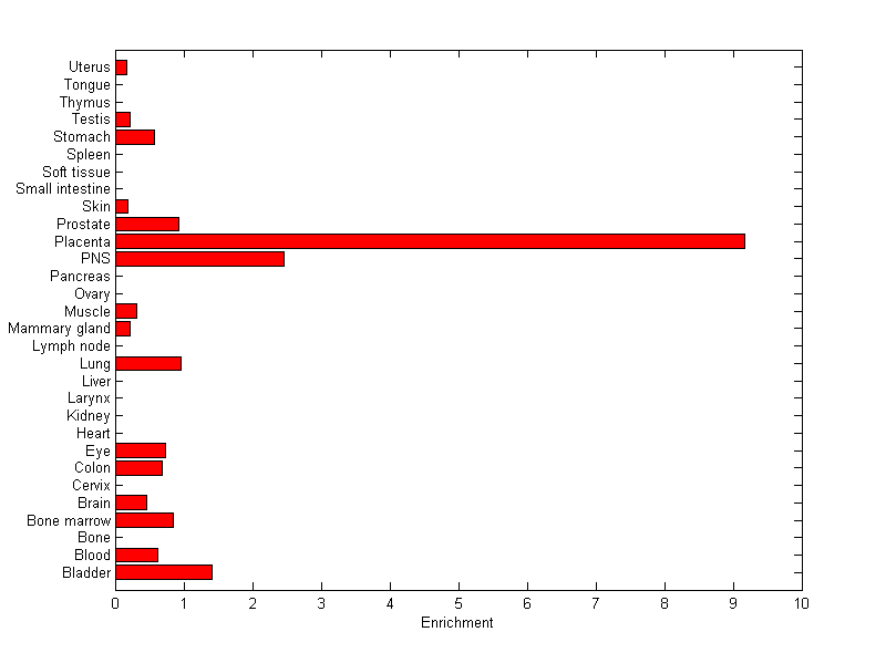 The expression level is normalized with tissue-library size. Each value for a gene in a tissue is a ratio of observed ESTs to the expected one in this tissue. The expected number of ESTs is the product of total ESTs of the gene and the fraction of total ESTs in the tissue among all ESTs in 30 tissues.