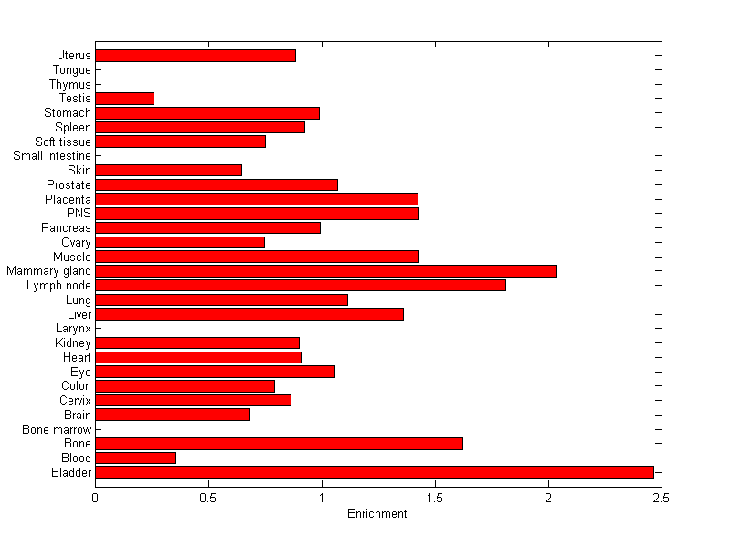 The expression level is normalized with tissue-library size. Each value for a gene in a tissue is a ratio of observed ESTs to the expected one in this tissue. The expected number of ESTs is the product of total ESTs of the gene and the fraction of total ESTs in the tissue among all ESTs in 30 tissues.