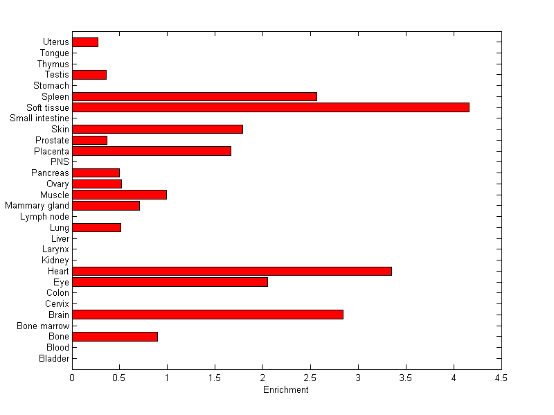 The expression level is normalized with tissue-library size. Each value for a gene in a tissue is a ratio of observed ESTs to the expected one in this tissue. The expected number of ESTs is the product of total ESTs of the gene and the fraction of total ESTs in the tissue among all ESTs in 30 tissues.