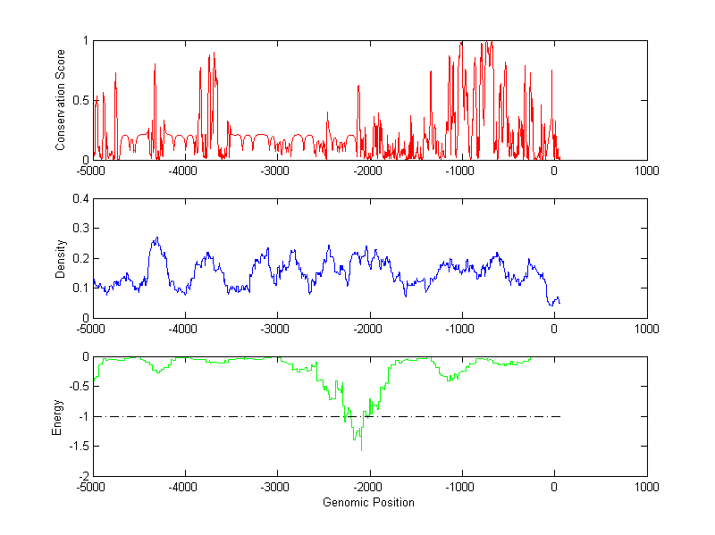 The energy profile (green curve) is about energy for module detection based on TF interaction. The positions with energy less than -1 indicate the existence of CRMs.