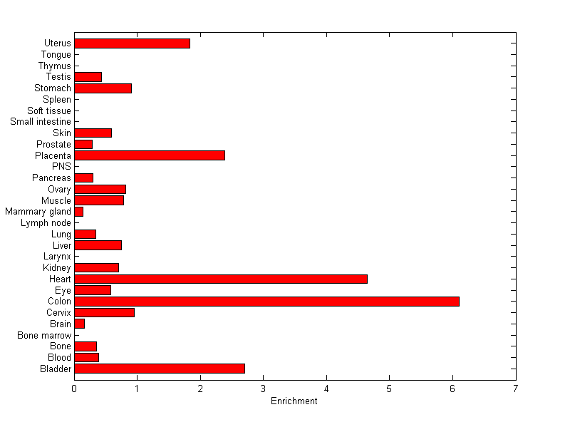 The expression level is normalized with tissue-library size. Each value for a gene in a tissue is a ratio of observed ESTs to the expected one in this tissue. The expected number of ESTs is the product of total ESTs of the gene and the fraction of total ESTs in the tissue among all ESTs in 30 tissues.