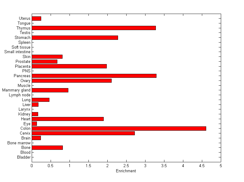The expression level is normalized with tissue-library size. Each value for a gene in a tissue is a ratio of observed ESTs to the expected one in this tissue. The expected number of ESTs is the product of total ESTs of the gene and the fraction of total ESTs in the tissue among all ESTs in 30 tissues.