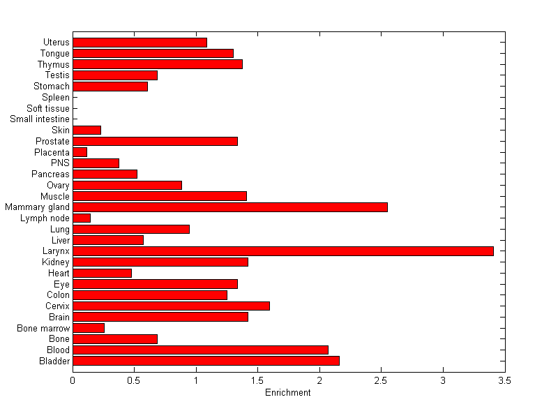 The expression level is normalized with tissue-library size. Each value for a gene in a tissue is a ratio of observed ESTs to the expected one in this tissue. The expected number of ESTs is the product of total ESTs of the gene and the fraction of total ESTs in the tissue among all ESTs in 30 tissues.