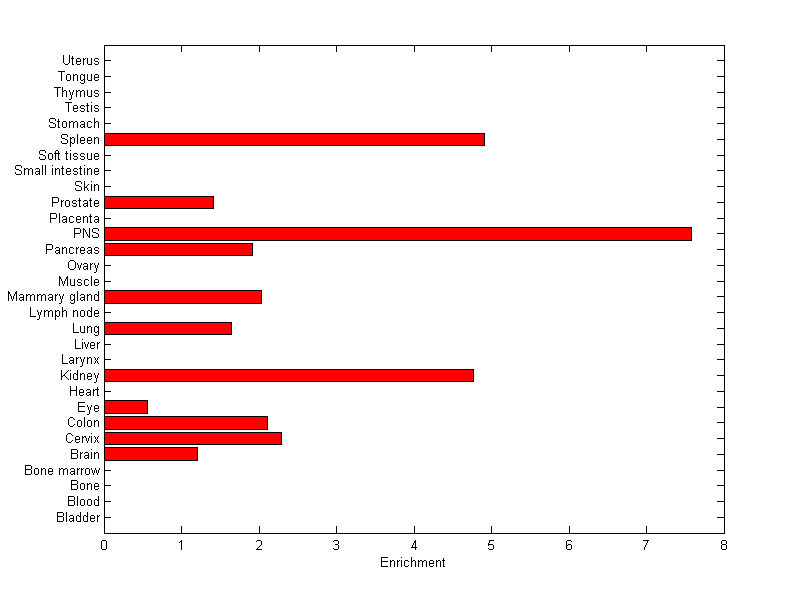 The expression level is normalized with tissue-library size. Each value for a gene in a tissue is a ratio of observed ESTs to the expected one in this tissue. The expected number of ESTs is the product of total ESTs of the gene and the fraction of total ESTs in the tissue among all ESTs in 30 tissues.