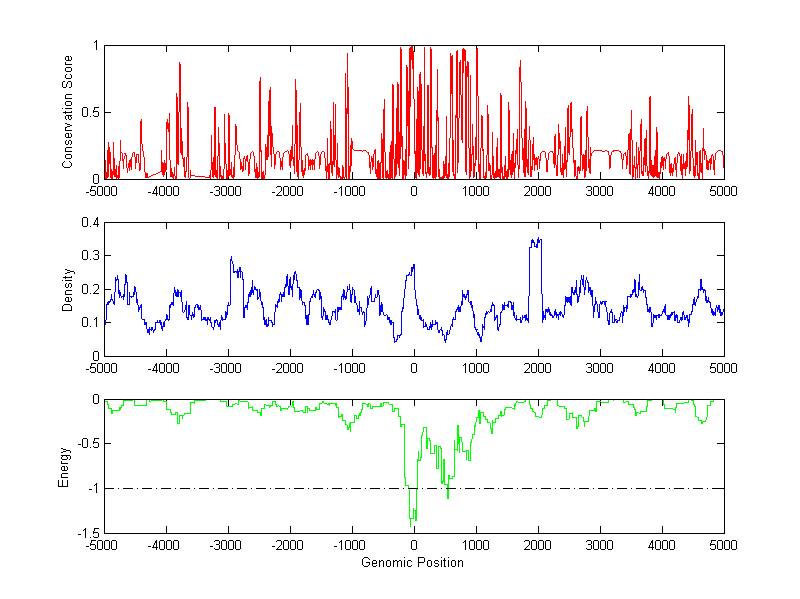 About the profiles: The conservation profile (red curve) is about conservation scores of the promoter sequences. Conservation was determined from an eight-way alignment of human, chimpanzee, dog, mouse, rat, chicken, zebrafish and fugu sequences. The conservation was quantified by a conservation score between 0 and 1, with 1 as highest conservation. The conservation score was obtained from UCSC genome databases. The density profile (blue curve) is about density of all TF binding sites. The energy profile (green curve) is about energy for module detection based on TF interaction. The positions with energy less than -1 indicate the existence of CRMs. Download: Conservation profileDensity profile Energy profile CRM summary |