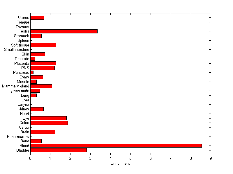About the profile: The expression level is normalized with tissue-library size. Each value for a gene in a tissue is a ratio of observed ESTs to the expected one in this tissue. The expected number of ESTs is the product of total ESTs of the gene and the fraction of total ESTs in the tissue among all ESTs in 30 tissues. Summary: This gene is preferentially expressed in [blood] Download: |