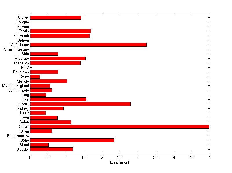 The expression level is normalized with tissue-library size. Each value for a gene in a tissue is a ratio of observed ESTs to the expected one in this tissue. The expected number of ESTs is the product of total ESTs of the gene and the fraction of total ESTs in the tissue among all ESTs in 30 tissues.