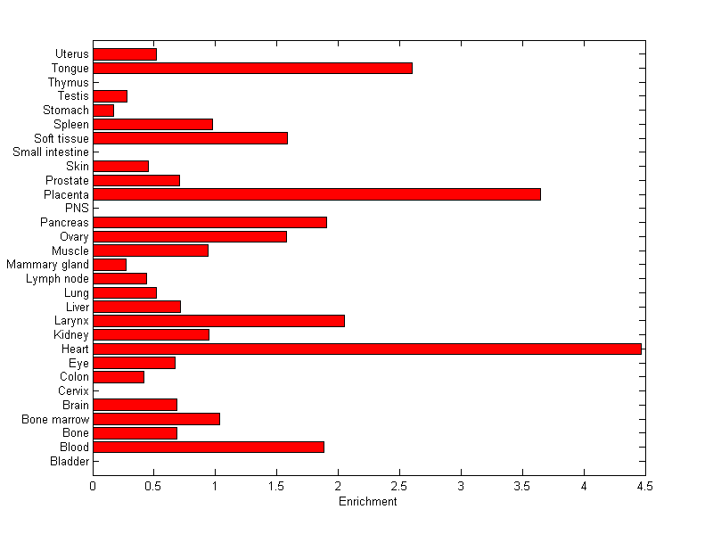 The expression level is normalized with tissue-library size. Each value for a gene in a tissue is a ratio of observed ESTs to the expected one in this tissue. The expected number of ESTs is the product of total ESTs of the gene and the fraction of total ESTs in the tissue among all ESTs in 30 tissues.