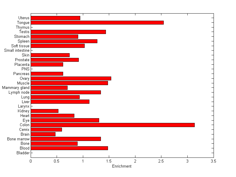 The expression level is normalized with tissue-library size. Each value for a gene in a tissue is a ratio of observed ESTs to the expected one in this tissue. The expected number of ESTs is the product of total ESTs of the gene and the fraction of total ESTs in the tissue among all ESTs in 30 tissues.